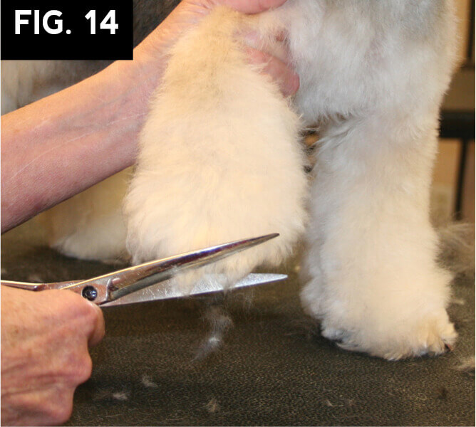Fig.14) Lift the front foot and trim straight across the front. Place the front foot on the table and round the edges with the scissors angled slightly outward.