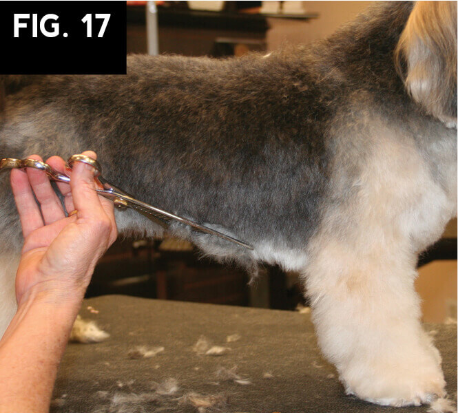 Fig.17) Use curved shears or blenders to blend the upper portion of the rear leg into the tuck up and then the tuck up into the underline. Follow the natural underline of the dog through the front legs and up towards the chest.