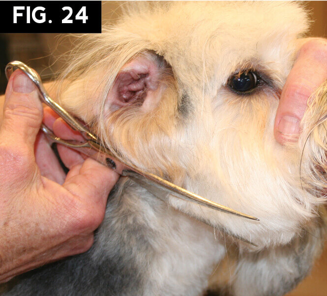 Fig.24) Use long curved shears from the bottom of the ear (where it meets the skull), curving down and then upward toward the nose.